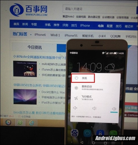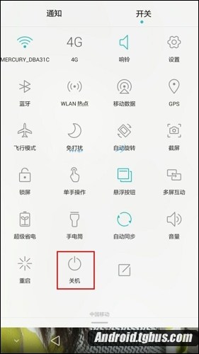 相信用過智能手機的朋友都知道,目前安卓手機和iphone手機最為常見或常用的方法就是使用電源按鍵關機,而榮耀6Plus的電源鍵位於機身右側中上部,我們用手指按住【電源鍵】幾秒鐘便可彈出“關機”,“重啟”或“飛行模式”的提示,我們點擊一下關機便可實現關機,如下圖所示。