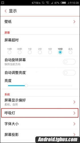 2、進入到顯示設置頁面之後,找到【呼吸燈】一欄,如下圖所示:
