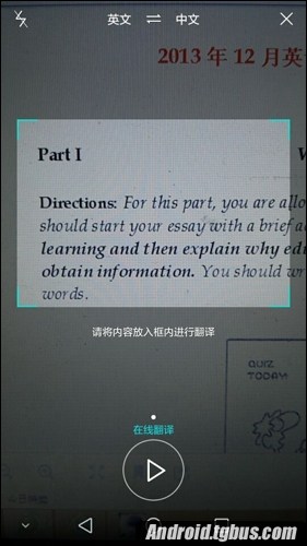 4、再接下來,將相機對著有英文的頁面,系統默認的是將英文翻譯成中文,,只需要把要翻譯的內容放入框內即可,如下圖所示: