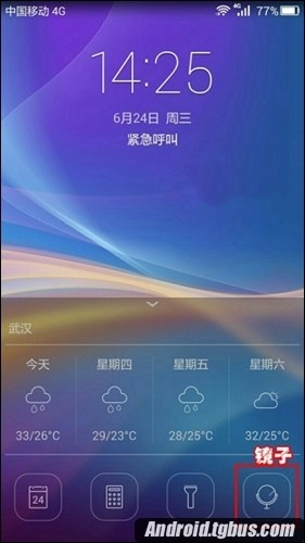 1、按一下電源鍵進入到滑動解鎖頁面,然後用手指往上滑一下,出現以下界面,或者在系統桌面找到【鏡子】應用圖標,點擊進入。