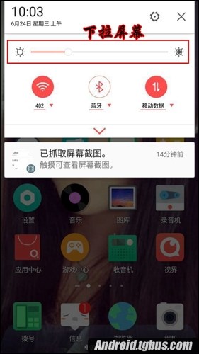 目前諸多智能手機都在下拉菜單通知欄設置有快捷功能,而對於努比亞Z9 mini來說,只需下拉屏幕便可看到屏幕亮度調節圖標,左右調節亮度即可,如下圖所示: