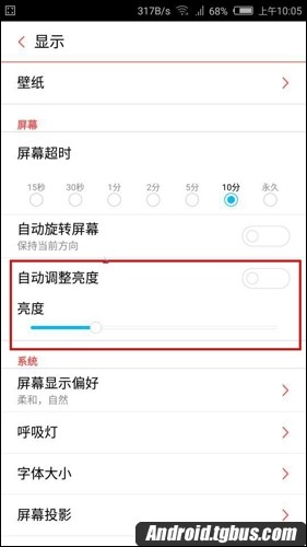 2、在努比亞Z9 mini顯示設置中,就可以看到屏幕亮度調節設置了,另外還可以勾選上“自動調整亮度”這樣努比亞Z9 mini會根據光線強度自動調節屏幕亮度,如下圖所示: