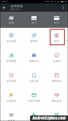 2、進入我的錢包後我們看到這裡有很多功能,充值話費、購買理財通、滴滴打車、購買彩票等。我們選擇其中的彩票。