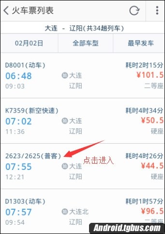 4、出現了一列列車車次表,我們選擇要乘坐的火車,點擊它,如下圖所示。