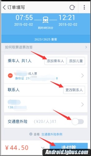 6、點擊“添加乘車人”,輸入姓名和身份證號碼,填寫或更改聯系人及電話,再選擇是否買保險,最後點擊右下角的“付款”進行在線支付,即可完成全部操作。