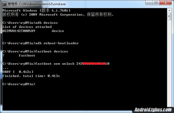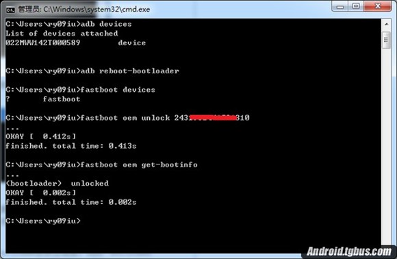 再輸入 fastboot oem unlock ****************,*號為16位解鎖密碼,例如:fastboot oem unlock 1234567812345678,回車確認,將會看到如下輸出,手機將發生重啟,重新進入fastboot模式,不出意外,已經解鎖成功