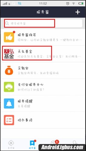 2、進入服務窗之後,大家卡看自己的服務窗項目中有沒有“天弘基金”,如果有那麼大家可以直接點擊進去,如果沒有就去搜索框中搜索添加即可,如下圖所示。