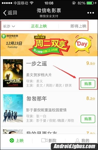 4、進入電影票界面後就可以選擇正在上映和即將上映的電影啦。最左邊還可以選擇你所在的城市。