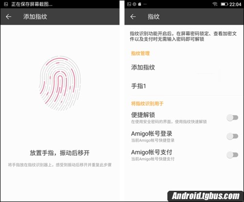 二、然後進入設置後,我們再找到“指紋設置”,點擊進入之後,就可以錄入指紋了,不難發現金立E8的指紋識別和其他指紋手機的添加方式一樣的,把手指放在上面然後移開接口錄制完成,如下圖所示。