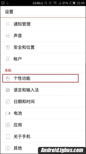 2、然後便看到了努比亞Z9 mini的設置界面,在其下方找到【個性功能】,點擊進入到聲音設置頁面,如下圖所示。