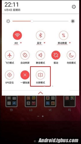 在下拉通知菜單欄界面,我們便可在努比亞Z9 mini下拉通知欄來快速開啟分屏模式,如下圖。