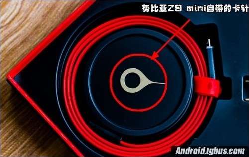 1、首先打開努比亞Z9 mini包裝盒,取下真機上層紙盒便可看到裡面放置一個卡針,如下圖所示: