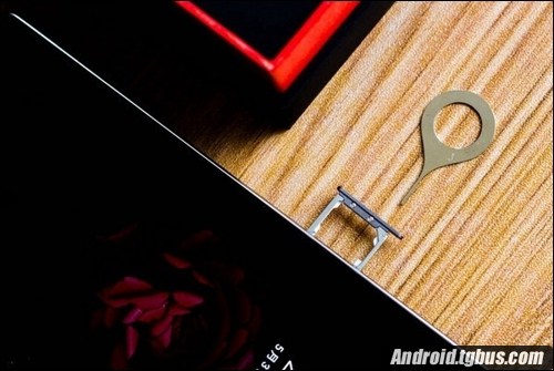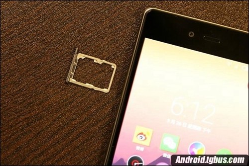 3、這裡需要注意的是,在取出努比亞Z9 mini內部的卡槽的時候,要留意一下正反面,以免等下不知道哪個方向裝入,取出之後,我們不難發現該機的卡槽采用了卡托式卡槽,位於機身左側,為復合型卡托,支持兩張nano-SIM卡,通吃三大運營商的所有網絡,如下圖所示: