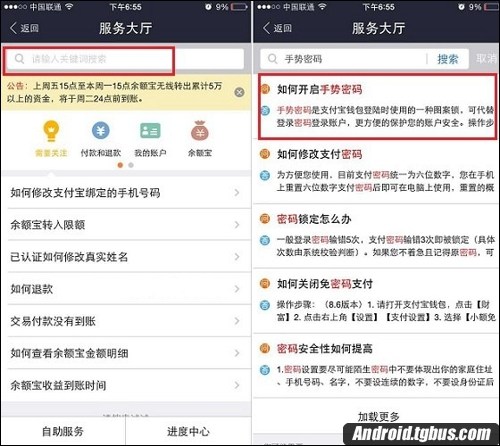 2、打開支付寶服務大廳後,在頂部搜索中輸入“手勢密碼”在搜索結果中,點擊進入“如何開啟手勢密碼”,如下示意圖所示。