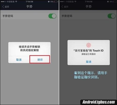 4、選擇開啟手勢密碼後,會提示:繼續開啟手勢解鎖將關閉指紋解鎖,如果需要開啟手勢密碼,則點擊底部的“繼續”,然後按照提示,將手指放在指紋處完成驗證,如下圖所示。
