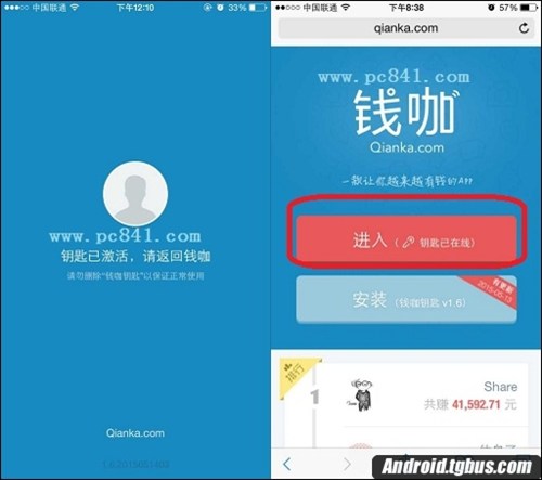 3、安裝完成後,返回手機界面找到“錢咖鑰匙”,點擊打開,頁面提示“鑰匙已激活......”,然後再次打開浏覽器,點擊“進入”,如圖: