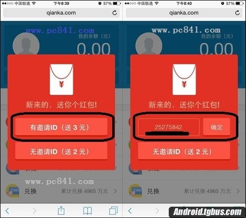 4、新用戶會有紅包收,會彈出如下頁面,然後點擊“有邀請ID送3元”,再輸入“25275842”點擊確定,就可以輕松獲得3元紅包了,如圖(賺錢在後面哦)。