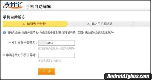 3、輸入您的支付寶賬戶名,再輸入凍結時的手機號碼,點擊【下一步】。