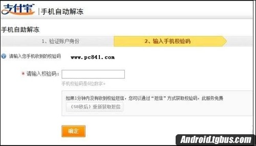 4、查看申請凍結時的手機上收到校驗碼,輸入校驗碼,點擊【確定】。