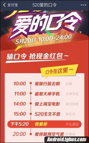 支付寶將聯合阿裡旅行、大神手機、淘寶電影、周生生、天弘基金以及杜蕾斯六大品牌共同舉辦“520愛的口號”搶紅包活動,時間上將從20日上午10時至晚24時分為六個時段,每個時段准時輸入相應口令即可獲得隨機金額紅包,先到先得搶完為止。以下就是520支付寶紅包口令,大家在特定的時間段輸入這些口令即可,非常簡單。