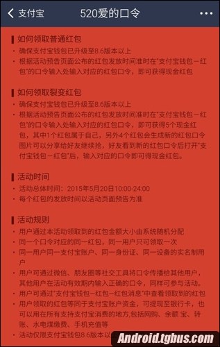 如果大家還不知道20支付寶紅包口令怎麼玩的話可以參考下這篇文章,另外在此需要提醒大家一下,本次活動紅包將會分為兩種:普通紅包和裂變紅包。其中下午5點20分的天弘基金紅包即是裂變紅包,輸入口令後會得到5個現金紅包,其中1個紅包屬於自己,另外4個會生產新的口令圖片可分享給小伙伴繼續搶,好友看到新的紅包口令輸入後即可得到現金紅包,想搶紅包的朋友們可千萬要手快哦。