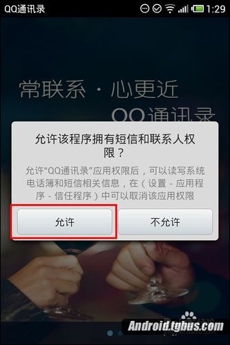 2、打開安卓手機的QQ通訊錄,會進行通訊錄授權的提醒,選擇“允許”。如果不選擇允許,則不能進行下面的操作。