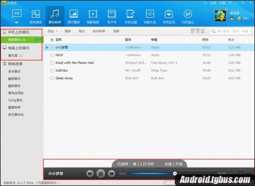 5、91助手的新功能還增加了一個,就是可以將91助手當做播放器使用:打開91助手——鈴聲管理---我的音樂或者音樂庫——選中音樂後即可播放。