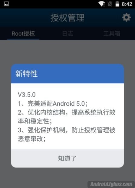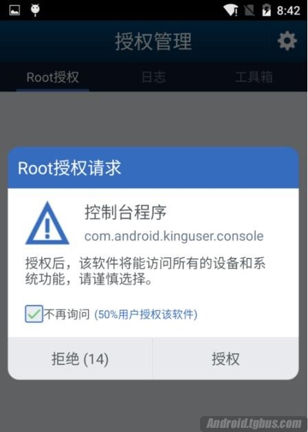 5、然後當你需要使用ROOT權限的時候,會彈出一個對話框,提示你是否允許獲取ROOT權限,點擊允許就可以了。