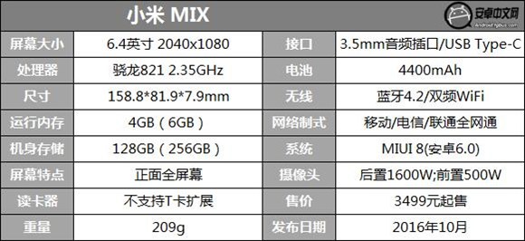 配置方面:小米MIX搭載骁龍821性能版處理器,標准版為4GB+128GB存儲組合,尊享版為6GB+256GB存儲組合,提供1600萬像素PDAF相機+500萬前置相機,支持HD高清音質,高精度定位(SAP輔助定位,過隧道也能定位),內置4400mAh大容量電池,支持快充3.0,運行MIUI 8系統。另外小米MIX還具備全功能NFC模組,支持刷公交卡、充值、交換信息等一眾功能。