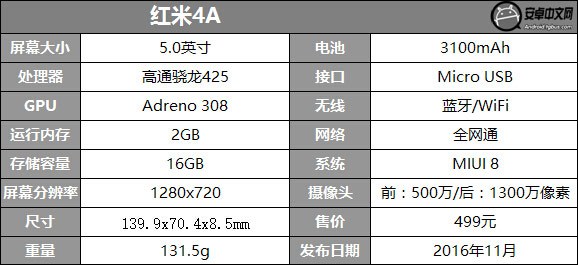 紅米4A搭載骁龍425處理器,配以2GB RAM+16GB ROM內存,前置500萬後置1300萬像素攝像頭,3120mAh電池,支持雙卡雙待全網通。整體配置上看,紅米4A基本就是這個價位該有的樣子,但是相比較大多數同級機型都在用聯發科芯片,紅米4A采用了高通的骁龍處理器。