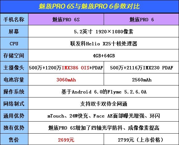 在外觀上,魅族PRO 6S與之前的魅族PRO 6並無太大區別,性能配置方面改變也不大,那它這6個月到底經歷了什麼呢?從上圖可以明確看出來,主要的改變在於攝像頭、電池容量上。它的攝像頭方面升級為IMX386傳感器,支持OIS光學防抖,成像素質比PRO 6提升了不少。其它細節方面也並無太大變化,比魅族PRO 6厚了0.05mm、重了3g。