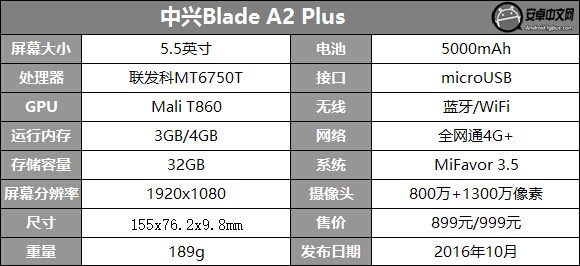 中興Blade A2 Plus主打長續航,其配備了5000mAh超大電池,同時還搭載MT6750T八核處理器,高配版4GB+32GB(此次我們收到的是標准版,3GB+32GB)存儲組合;前置攝像頭為800萬像素,支持160度廣角自拍,主攝像頭為1300萬像素,支持PDAF相位對焦;支持指紋識別;網絡制式方面支持雙卡雙待,全網通4G+。另外這款手機起售價僅899元,總體來看相當誘人。