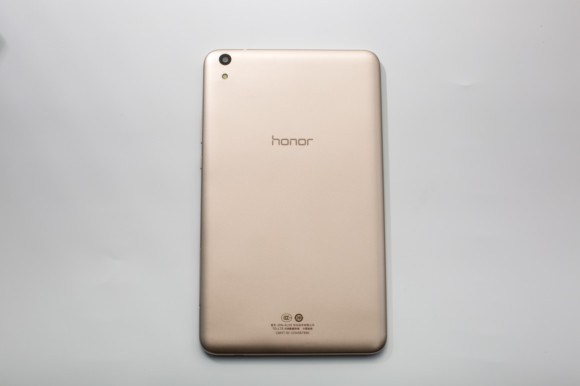 平板的背部采用一體化設計,左上方為攝像頭和閃光燈,中部為“HONOR”英文LOGO,下方為型號信息。800萬像素的後置攝像頭完全沒有凸起,這樣的設計最大程度的防止攝像頭磨損,相信給處女座或強迫症患者帶來了福音。頂部與底部分別為:耳機插入口與USB接口、降噪MIC,設計上簡潔明了。