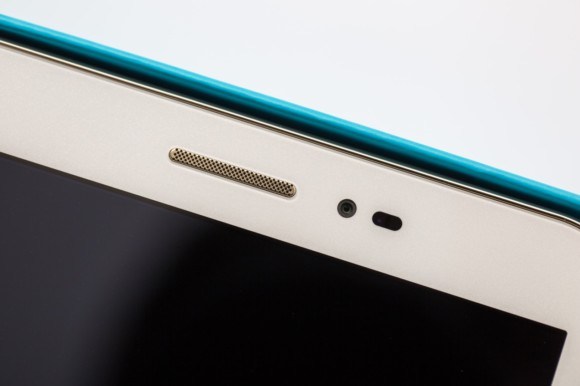 在正面外觀上,榮耀平板2整體以穩重主打,屏幕位置適中,使得整體更有和諧質感。同時,由於榮耀平板2是采用系統內置按鍵的設計,因此在觀感上給人以更加純粹的表現;8.0 英寸的全高清屏幕,較高的屏占比和較窄的BM區,視覺體驗非常好。而對於聽筒位置的設計而言,還是較為不錯的,聽筒的金屬網格十分細密,能有效防塵的同時保證了通話質量。另外,200萬像素的前置攝像頭足以支持720P(30fps)視頻通話,聽筒和喇叭、攝像頭、光線/距離感應器三個部件和諧的排列成行,簡潔的設計凸顯出榮耀平板中平面的主體地位。