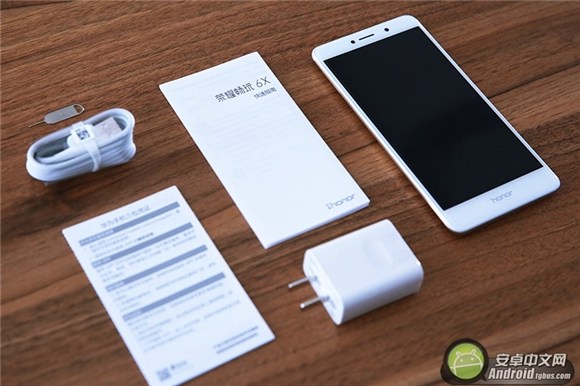 首先,小編先為大家做個開箱,榮耀暢玩6X包裝盒內,帶有一個榮耀暢玩6X手機、一個電源適配器、一個Micro USB數據線、一個三包憑證以及一個卡針。