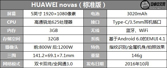 配置方面,HUAWEI nova搭載了高通骁龍625處理器,14nm CPU,八核A53 64位處理器,標配版為3G+32G組存儲組合,高配版為4G+64G存儲組合,整體來看,這樣的硬件配置完全可以滿足我們日常需求。同時它還擁有3020mAh大電池,這對於對手機非常依賴的年輕人來說可是至關重要的,長續航才能讓自己的生活不斷電。屏幕尺寸為5英寸,分辨率很高,達到了1920x1080像素。而在社交方面的配置,nova配備了800萬像素+1200萬像素的前後攝像頭組合,更有實時美顏功能加入,什麼曬朋友圈、視頻聊天、網絡直播都不在話下。