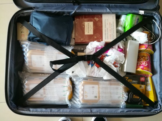 看看我都帶了什麼:稻香村的蜂蜜蛋糕、京八件、綠豆糕、八罐豆瓣醬、若干本書(為什麼不買電子書,我咋知道)、四條煙。對了,那兩盒泡面是我的,改善口味用的,書包裡還裝了兩盒即食酸辣湯飛機上也有熱湯喝(沒辦法中國胃,吃不慣西餐)。