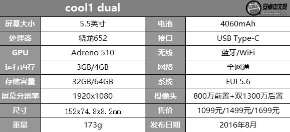 作為一款千元雙攝手機,cool1 dual從硬件配置上可以說相當厚道,其CPU方面使用八核64位高通骁龍652處理器,也是千元左右少有使用骁龍652的手機。使用上了3G/4GB的大內存以及提供32GB的機身儲存,規格也是比較高。屏幕方面是采用5.5英寸1080P屏幕,擁有雙1300萬像素的攝像頭,彩色加上黑白攝像頭,另外還有800萬像素的前置攝像頭。電池方面擁4060mAh大電池,網絡方面支持雙卡雙待支持全網通。