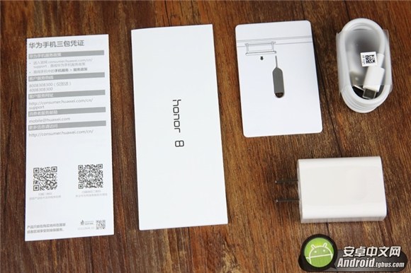 配件方面,榮耀8附帶了電源適配器。Type-C USB數據線以及入門指南與保修憑證。不過榮耀8的包裝盒並不能像榮耀V8那樣折成虛擬眼鏡。