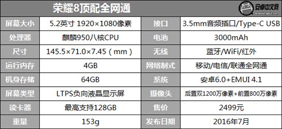 本次評測的是榮耀8的頂配版本,也就是4GB RAM+64GB ROM版機型。網絡制式為全網通,支持移動/聯通/電信的4G+/4G/3G/2G網絡,卡槽1、2可任意切換主、副卡,值得注意的是,1、2卡不能同時使用2張電信卡。處理器為麒麟950八核CPU,最高主頻為2.3GHz。屏幕尺寸為5.2英寸,分辨率為FHD級別,1920×1080像素。攝像蜂蜜,榮耀8同樣配備了1200萬像素雙攝像頭與800萬像素前置攝像頭,無論哪種角度拍攝都能提供完美的拍照體驗。