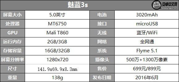 2016年6月13日,魅族在中國電影導演中心發布了新機--魅藍3s,該機在魅藍3大受歡迎的基礎上,增添了指紋識別、全金屬機身等諸多亮點,而其售價僅699元起,再次拉起了國內市場的質價比手機熱潮。