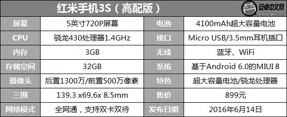 紅米手機3S采用手感適中的5英寸屏幕,搭載高通骁龍430八核處理器,內置3GB+32GB的內存組合,擁有4100mAh的大容量電池,前置500萬像素攝像頭,後置1300萬像素攝像頭,並且支持指紋識別功能。