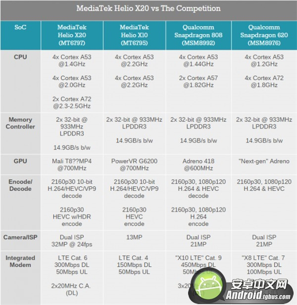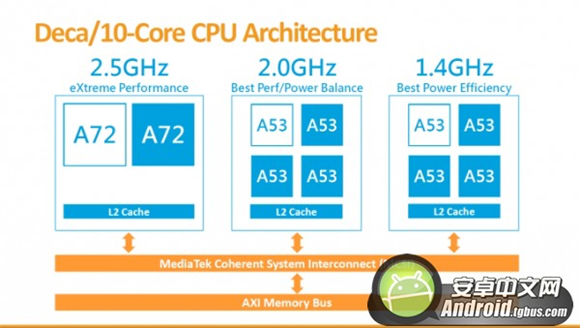 聯發科Helio X20是世界上首款10核心處理器,處理器使用了三個處理器簇(Cluster),包含了一個低功耗的1.4GHz四核心A53處理器,一個平衡性能和功耗的2.0GHz四核心A53處理器,以及一個用於沖刺極限性能的2.5GHz的雙核心A72處理器。視頻編碼解碼性能方面,聯發科稱X20能耗比相對於X10提高了30%~40%。
