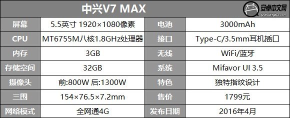 V7 MAX采用5.5英寸1080P分辨率屏幕,搭載聯發科八核處理器,後置1600萬像素、前置800萬像素鏡頭、支持PDAF相位對焦,內置3000mAh容量電池(Type-C接口),支持雙卡雙待和最大128GB Micro SD卡擴展,系統為Android 6.0。支持雙卡雙待,支持盲插。