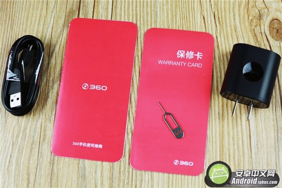 紅黑配色包裝看上去簡潔大方。配件方面,360手機提供了電源適配器、USB 數據線、SIM卡頂針、手機保修證書與手機說明書。
