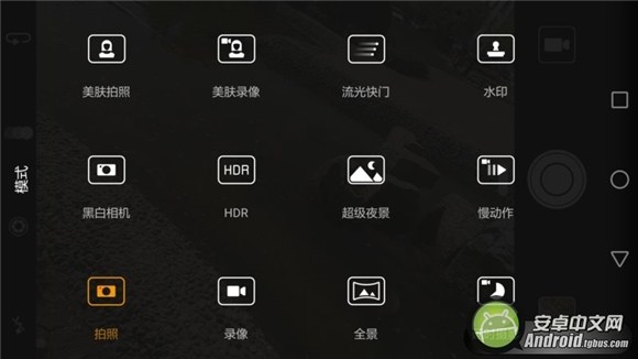 在相機設置界面中,我們可以看到它的諸多功能。向左滑動可以呼出設置界面,我們從中可以進行照片質量調節、參考線選擇、笑臉抓拍等功能設置。向右滑動可以找到他不同的拍照模式,包括:美膚拍照、流光快門、黑白相機、HDR、超級夜景、全景、延時攝影等等。