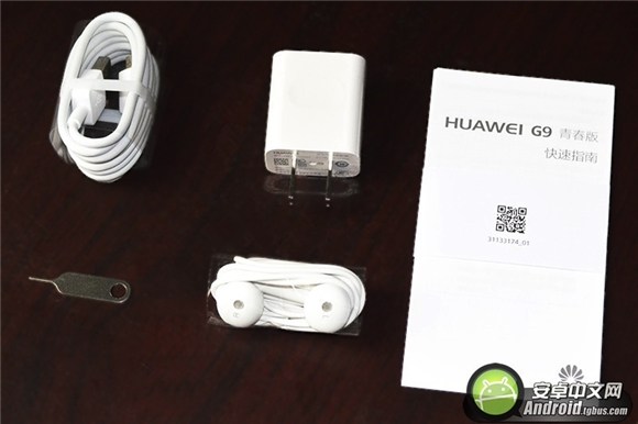 HUAWEI G9青春版為白色包裝盒子。配件方面,手機附帶了快速指南、三包憑證、電源適配器、Micro USB接口數據線、保護膜(已貼於手機屏幕)以及耳機。相比現在的手機配件來說,這已經非常厚道了。