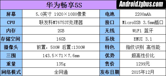 華為暢享5S擁有5.0英寸1080P分辨率屏幕,聯發科MT6753T處理器,2GB RAM+16GB ROM,EMUI 3.1操作系統,前置500萬後置1300萬像素攝像頭,擁有超乎想像的拍照能力,而指紋識別功能更是增加了手機的便捷及安全性,目前華為暢享5S全網通版售價為1299元,感興趣嗎?