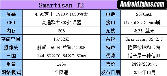 Smartisan T2采用了一塊4.95英寸的1080P屏幕,並采用雙面2.5D玻璃;一枚高通骁龍808處理器算是一種較為保守的搭配,但個人覺得現在足夠用了;3GB RAM+16/32GB ROM;前置500萬後置1300萬像素攝像頭;全新Smartisan OS 2.5操作系統;2670mAh電池容量;全網通網絡制式;16GB版本售價2499元,32GB版本售價2599元。