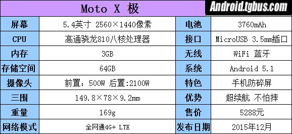 5.4英寸2K分辨率的獨創智能手機防碎屏,這個便是Moto的黑科技,不過真的很厲害;高通骁龍810處理器,哪怕使用了3760mAh的超大容量電池,在續航方面還是略顯尴尬;3GB RAM+64GB ROM的確帶來的非常流暢的操作及性能體驗;前置500萬像素後置2100萬像素攝像頭,雙面都配有LED補光燈;支持全網通的網絡制式,並支持最新的4G+ LTE網絡,擁有更加極速的網絡傳輸速度;售價方面,Moto X 極售價為5288元,真心不是一般貴!